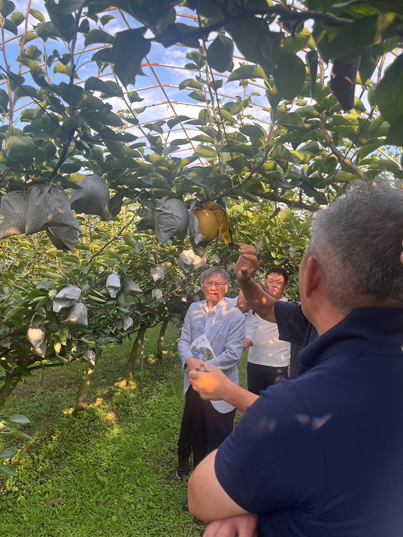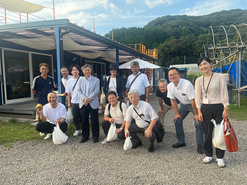 ブランド梨農家の大川三世代では、代表の田代氏により講話いただきました。当社で採用している梨栽培の技術であるジョイント栽培は、接ぎ木をしてすべての列の木をつなげることで、剪定作業が楽になり、管理しやすくなるということでした。また、ハウス栽培を中心としており、時期を早めて都市部に出荷することで高額で出荷することができていると話されました。